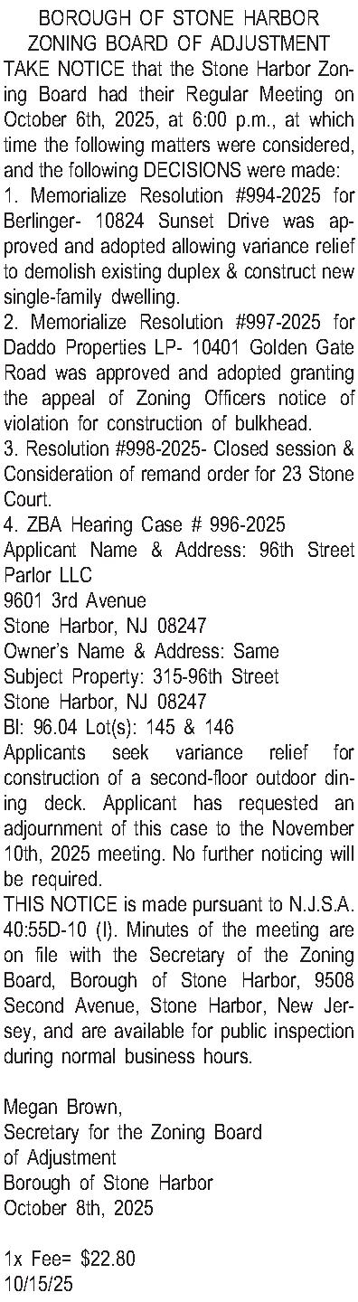 TAKE NOTICE that the Stone Harbor Zoning Board had their Regular Meeting on October 6th, 2025, at 6:00 p.m., at which time the following matters were considered, and the following DECISIONS were made: